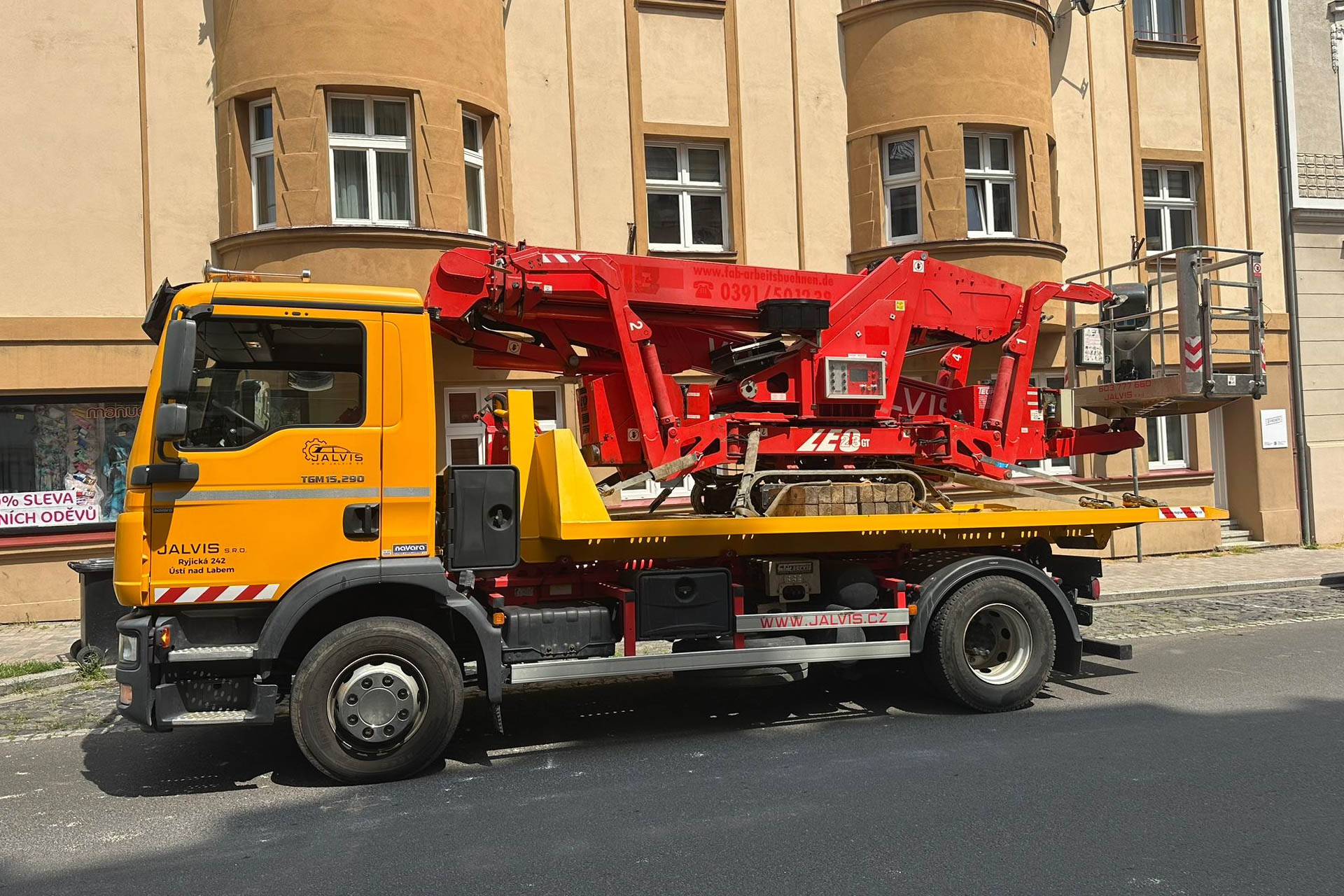 Přepravu pásového vysokozdvižné plošiny zajišťujeme standardně vlastním hákovým nosičem kontejnerů MAN TGM nebo nákl. vozidlem DAF CF s hydraulickou rukou. Díky této technice jsme schopni stroj flexibilně a bezpečně dopravit přímo na místo realizace zakázky.